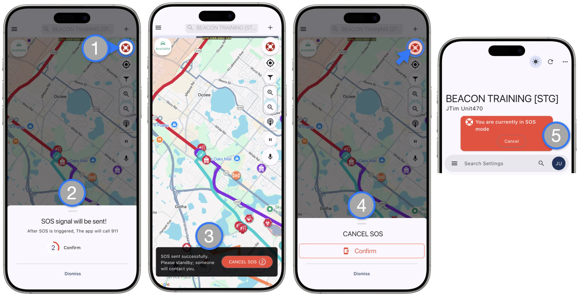 • The SOS button will continuously flash red as a visual indicator for Responders when they are in SOS Mode